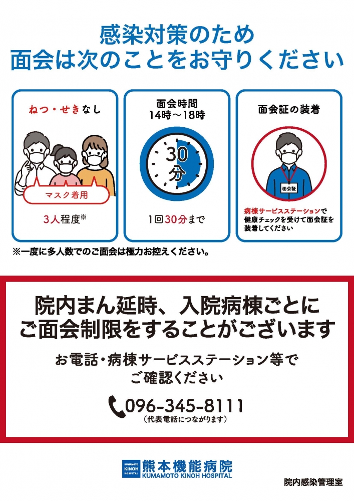 【令和8年4月6日更新】面会について 2023/07/28 お知らせ大切なお知らせ Facebook twitter はてなブックマーク 【令和8年4月6日更新】 現在、面会中止となっている病棟はございません。 当院ではインフルエンザ、新型コロナなどの感染対策を行っています。 ご面会の際は、下記のルールを必ずお守りいただきますようお願いいたします。 ご用命は病棟ステーションにお声かけください。